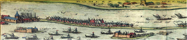 Spaanse troepen in het nauw op de Empelsedijk (Kaart Hogenberg)